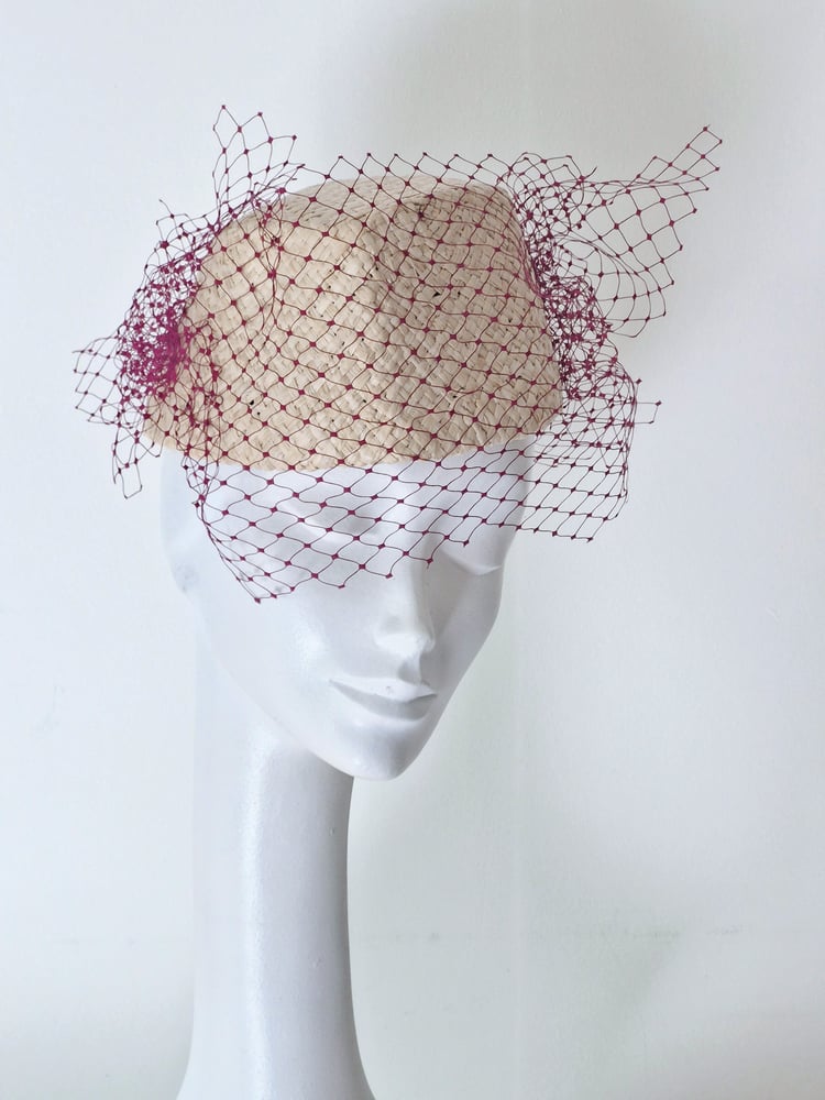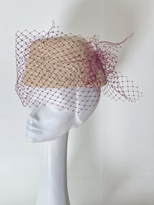 Straw toque with interesting angles, trimmed with burgundy veiling