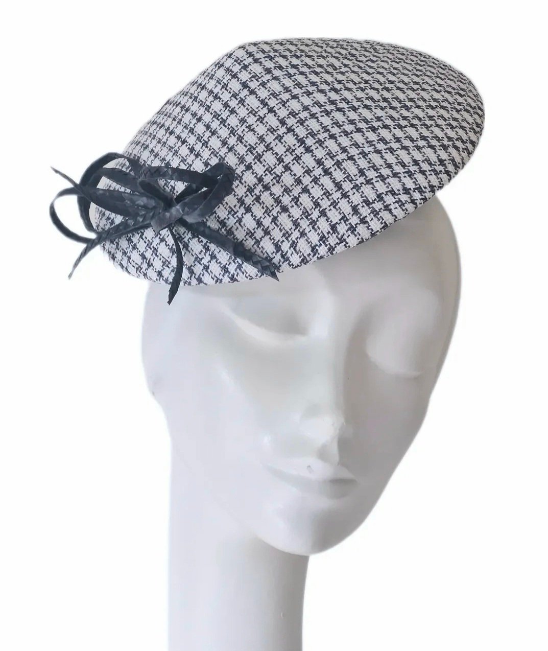 Coolie shape on a beret base, covered in white/navy straw cloth. Trimmed with braid bows