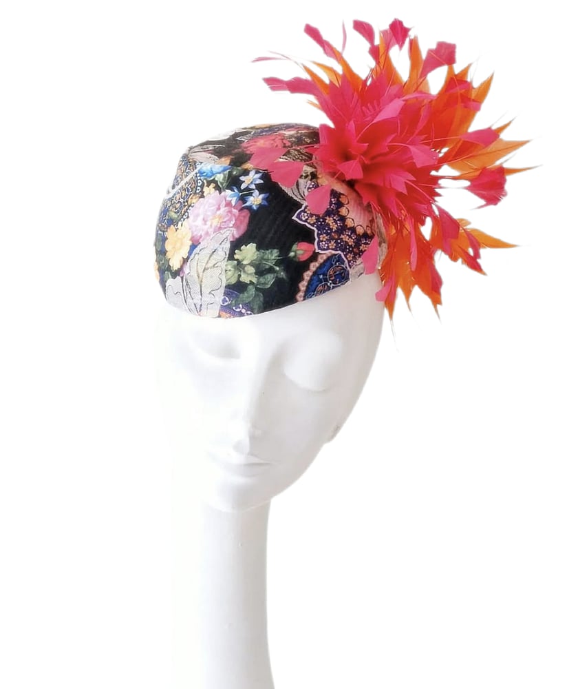 Frabric covered toque. Feather trim