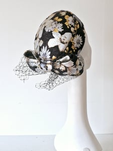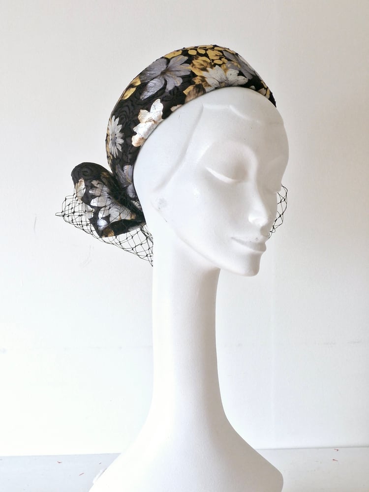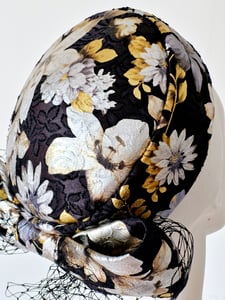Pillbox, covered in fabric with metallic gold and solver floral print, trimmed with bow and veiling